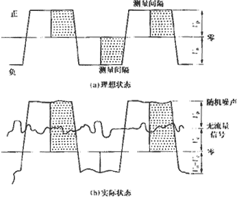 在實(shí)際情況下,如果零點(diǎn)或者“零流量”信號(hào)在正方向上產(chǎn)生一個(gè)Ve的偏移量,那么正向信號(hào)便是VP+Ve),負(fù)向信號(hào)是(Vn-Ve),(見圖4b)。因此電極信號(hào)的總值是(VP+Vn),零點(diǎn)偏移被消除。如果偏移在負(fù)方向,也同樣適用。