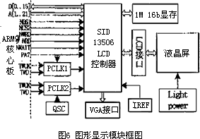 由于AT9lRM9200處理器未集成圖形顯示,核心板上也未提供,所以,要實現(xiàn)圖形顯示,必須構(gòu)建圖形顯示模塊。電路采用LCD控制器SID13506顯示芯片[7]實現(xiàn)彩色液晶點陣顯示和VGA標(biāo)準(zhǔn)接口。系統(tǒng)框圖如圖6所示。