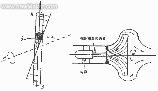 早期設(shè)計(jì)的科氏力質(zhì)量流量計(jì)的結(jié)構(gòu)如圖2所示。將在由活動(dòng)流體的管道送進(jìn)一旋轉(zhuǎn)系統(tǒng)中,由安裝在轉(zhuǎn)軸上的扭矩傳感器,來(lái)完成質(zhì)量流量的丈量。這種流量計(jì)只是在試驗(yàn)室中進(jìn)行了試制。