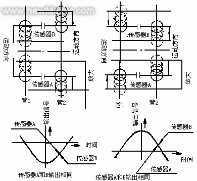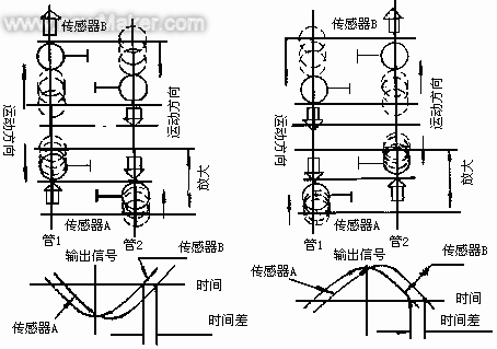 如圖23a,當(dāng)管子分開(kāi)時(shí),在振點(diǎn)前的流體中產(chǎn)生的科里奧利力與振動(dòng)力方向相反,減慢管子的運(yùn)動(dòng)速度;而在振點(diǎn)之后管中流體產(chǎn)生的科氏力與振動(dòng)方向相同,加快管子的運(yùn)動(dòng)速度。當(dāng)驅(qū)動(dòng)器使管子靠近時(shí),如圖23b,則產(chǎn)生相反的結(jié)果。在A、B兩點(diǎn)的傳感器可測(cè)的兩處管字運(yùn)動(dòng)的相位差,由此可得到流過(guò)測(cè)管中流體的質(zhì)量流量。