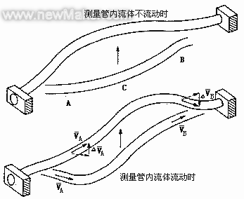 當(dāng)丈量管中流體以速度V在管中活動(dòng)時(shí),由于受到C點(diǎn)振動(dòng)力的影響(此時(shí)的振動(dòng)力是向上的),流體質(zhì)點(diǎn)從A點(diǎn)運(yùn)動(dòng)到C點(diǎn)時(shí)被加速,質(zhì)點(diǎn)產(chǎn)生反作用力F1,使管子向上運(yùn)動(dòng)速度減慢;而在C點(diǎn)到B點(diǎn)之間,流體質(zhì)點(diǎn)被減速,使管子向上的運(yùn)動(dòng)速度加快。結(jié)果在C點(diǎn)兩邊的這兩個(gè)方向相反的力使管子產(chǎn)生一個(gè)變形,這個(gè)變形的相位差與測(cè)管中流體流過(guò)的質(zhì)量流量成正比。