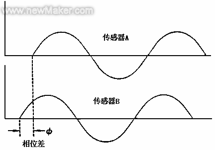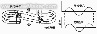 隨著振蕩運(yùn)動(dòng)的進(jìn)行,丈量管被周期性地分開(kāi)、靠攏,科氏力也周期性地作用在兩根丈量管上,通過(guò)安裝在丈量管上的位移創(chuàng)按其A、B,測(cè)出由科氏力引起的丈量管相對(duì)位置的變化,通常轉(zhuǎn)化為測(cè)兩點(diǎn)的相位差,如圖7所示。這個(gè)相位差的大小與質(zhì)量流量成正比。