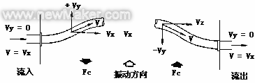當(dāng)流體質(zhì)點(diǎn)有進(jìn)口流進(jìn)圖示振動(dòng)方向的丈量管時(shí),流體質(zhì)點(diǎn)的垂直活動(dòng)速度為+Vy,同樣在流體質(zhì)點(diǎn)流向出口時(shí),其垂直活動(dòng)速度為-Vy。由此可以推出,流體質(zhì)點(diǎn)在通過(guò)振動(dòng)的丈量管時(shí),垂直方向的速度是一個(gè)從零逐漸加大,直到中間最大,再逐漸減小到零的過(guò)程。由力學(xué)原理可知,速度的變化是由加速度引起的,而加速度是力作用于其上的結(jié)果。根據(jù)這個(gè)原理,稱(chēng)這個(gè)垂直速度變化為科氏加速度Ac,因此作用于流體質(zhì)量M上的科氏力為Fc=Mac。在丈量管上與中心間隔相等的兩點(diǎn)上,作用的科氏力大小相等,方向相反。