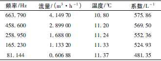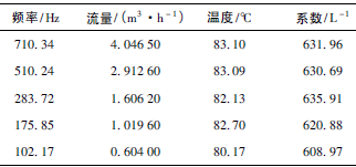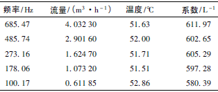 根據(jù)上述檢測(cè)設(shè)備及條件,按照J(rèn)JG1037—2008《渦輪流量計(jì)檢定規(guī)程》,在四種不同黏度下各檢定5個(gè)點(diǎn),每點(diǎn)檢定3次,得到的數(shù)據(jù)如表1~表4所示,數(shù)據(jù)表中的頻率、流量、溫度、系數(shù)均為每點(diǎn)檢定3次各自的平均值。由表1得到儀表線性度為8.9%,儀表系數(shù)為528.61L-1;由表2得到儀表線性度為6.3%,儀表系數(shù)為553.89L-1;由表3得到儀表線性度為2.6%,儀表系數(shù)為596.18L-1;由表4得到儀表線性度為2.2%,儀表系數(shù)為622.44L-1。