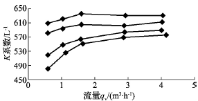 另外,從表1~表4均可看出,流量計(jì)黏度的變化對(duì)流量最小點(diǎn)影響也比較大,在四種不同黏度下,系數(shù)都在流量最后一點(diǎn)時(shí)發(fā)生了明顯的下降;而且黏度最大為93.24cSt時(shí),系數(shù)從524.93L-1變?yōu)?81.35L-1,系數(shù)下降了43.58L-1;黏度為7.16cSt時(shí),系數(shù)從620.88L-1變?yōu)?08.97L-1,系數(shù)僅下降了11.91L-1。從中可看出,隨著黏度的變小,對(duì)流量計(jì)下限的影響也越來(lái)越小。黏度變化對(duì)渦輪流量計(jì)特性曲線的影響如圖2所示。圖2中特性曲線從下至上依次對(duì)應(yīng)表1、表2、表3和表4,儀表系數(shù)隨著黏度的升高而下降,用于較高黏度時(shí),儀表系數(shù)與流量之間不再保持線性關(guān)系,因此,渦輪流量計(jì)測(cè)量高黏度時(shí),必須根據(jù)黏度和流量進(jìn)行修正。圖2中特性曲線的擬合公式為:
