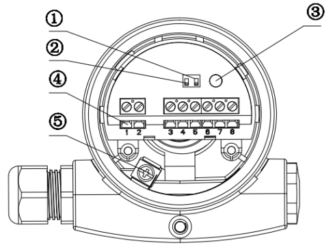 ①密度開關(guān) ② 高低位模式 ③ 指示燈 ④ 接線端子 ⑤ 接地端子