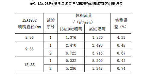 最后將ISA1932噴嘴測量裝置與ASME噴嘴測量裝置的測量結(jié)果進(jìn)行比較。由于兩套ISA1932噴嘴測量裝置一致性良好,用于比較的是兩套裝置測量結(jié)果的平均值。試驗(yàn)結(jié)果見表3。