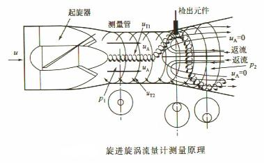 受周圍約束,旋流通過截面積擴(kuò)大的管段時,產(chǎn)生旋渦旋進(jìn)流動,即旋渦中心軸作進(jìn)動,進(jìn)動頻率與流體流速成正比。因此根據(jù)進(jìn)動頻率確定流體流量。